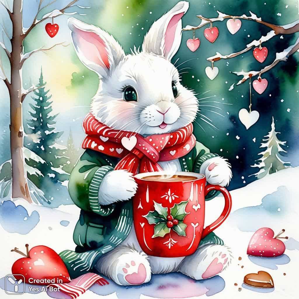 antasy in the style of Eve Farb, English watercolor painting, pearly, mother-of-pearl, cute. A cute pink teddy rabbit holds a mug of cocoa in its front paws. small white hearts are painted on the red mug, steam rises above the mug. the rabbit is wearing a dark green woolen long scarf. the atmosphere of winter and magic.