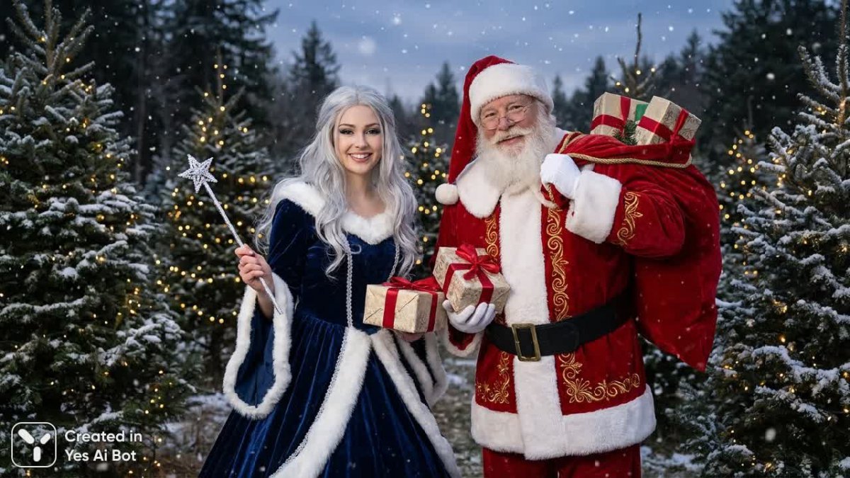 Волшебная встреча в сердце зимы! Перед нами молодая женщина с роскошными серебристыми волосами, воплощение ледяной королевы в великолепном синем наряде, украшенном белоснежным мехом. Рядом – веселый старик в ярком красном костюме Санты с золотыми акцентами, излучающий тепло и радость праздника. За ними простирается заснеженный пейзаж, усыпанный мерцающими огоньками сказочных гирлянд, создающих неповторимую атмосферу чуда и волшебства. В руках герои держат подарки и сверкающую палочку, готовые подарить незабываемые моменты счастья. Мягкий снежок кружится в воздухе, добавляя картине нежности и уюта. Снято на профессиональное оборудование Canon EOS R5 с объективом RF 24-70mm f2.8L lens, что позволило запечатлеть каждый нюанс с потрясающей четкостью и детализацией – взгляд сделан на уровне глаз, что обеспечивает эффект полного погружения в происходящее. Высокое разрешение и кинематографический шарм делают это изображение идеальным для создания атмосферы праздника и рождественского волшебства, передавая ощущение тепла, любви и надежды. Идеальный кадр, воплощающий дух зимних чудес и семейного счастья