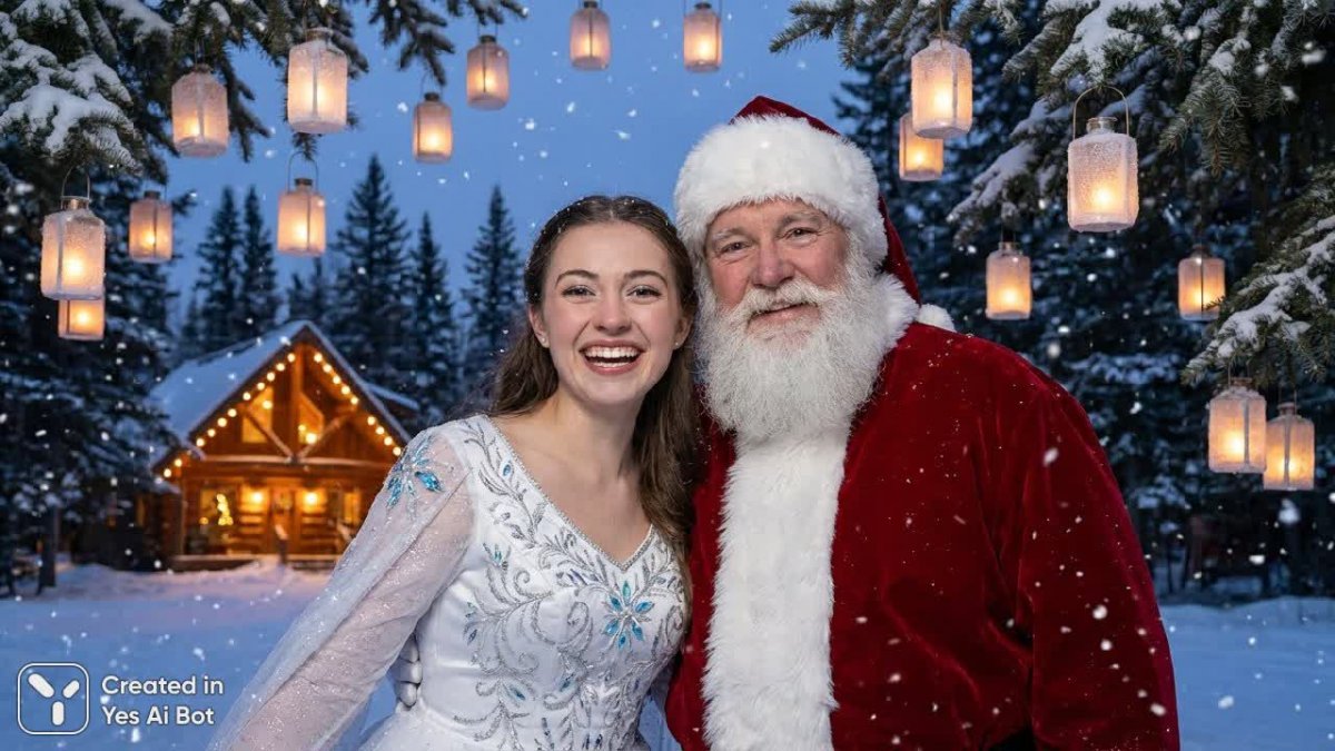young woman dressed in a shimmering white gown with icy blue accents, smiling broadly next to a cheerful man in a classic red santa suit, surrounded by snowflakes and glowing lanterns, winter wonderland scene with a cozy cabin in the background, canon eos r5, 85mm f/1.2 lens, low angle, ultra high resolution, magical holiday vibe