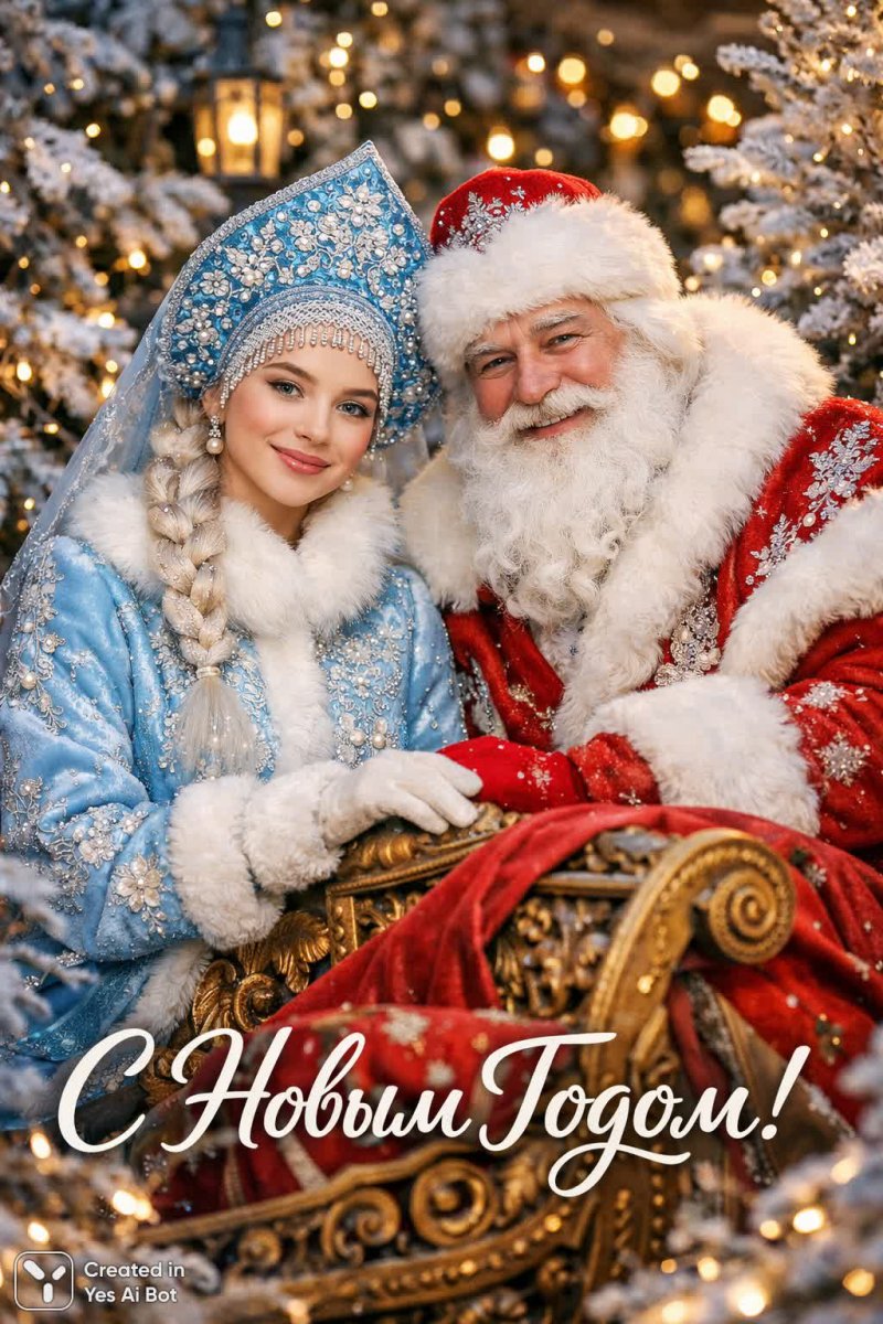 professional photo, canon eos r5, sigma art 50mm f1.4, cinematic angle, photorealistic, festive, postcard, high detail, soft lighting, winter, magic atmosphere, russian folklore, christmas decorations, snow maiden with blue kokoshnik, next to smiling father frost, both surrounded by twinkling garlands, ornate wooden sled, delicate frosted trees, magical fairytale mood, text on russian