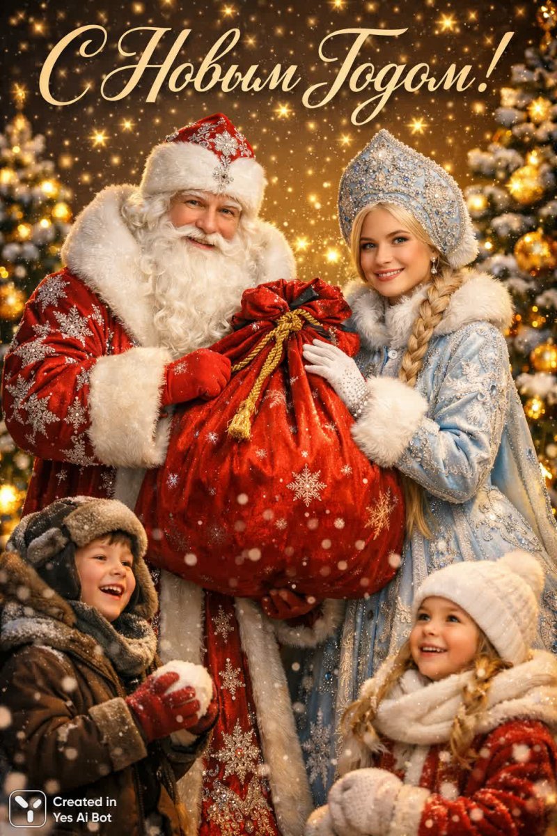 Волшебная новогодняя открытка, пропитанная духом русского фольклора. На фотографии запечатлен сам Дед Мороз со Снегурочкой, неспешно несущие мешок с подарками на плечах. Идеально подобранный канон EOS R5 и объектив Sigma Art 50mm f1.4 позволили создать кинематографичный кадр с потрясающей фотореалистичностью и невероятной детализацией. Плавное мягкое освещение подчеркивает праздничную атмосферу, а нежный снег добавляет зимнего очарования происходящему. Яркие украшения на елях, мерцающие гирлянды и золотое звездное небо создают ощущение настоящего новогоднего чуда. На заднем плане весело играют дети, наполняя сцену радостью и беззаботным настроением. Вся композиция выдержана в мягких тонах, что придает ей особую теплоту и душевность. Использование кинематографического угла съемки добавляет динамики и глубины изображению. Картина буквально излучает волшебство и сказку, идеально подходя для передачи новогоднего настроения близким людям. Открытка наполнена деталями и создает ощущение присутствия в этом праздничном моменте, передавая атмосферу зимней ночи, наполненной радостью и ожиданием чуда. Текст на русском языке дополняет визуальную составляющую, усиливая ее эмоциональное воздействие. Это настоящее произведение искусства, запечатлевшее самые яркие моменты новогоднего волшебства