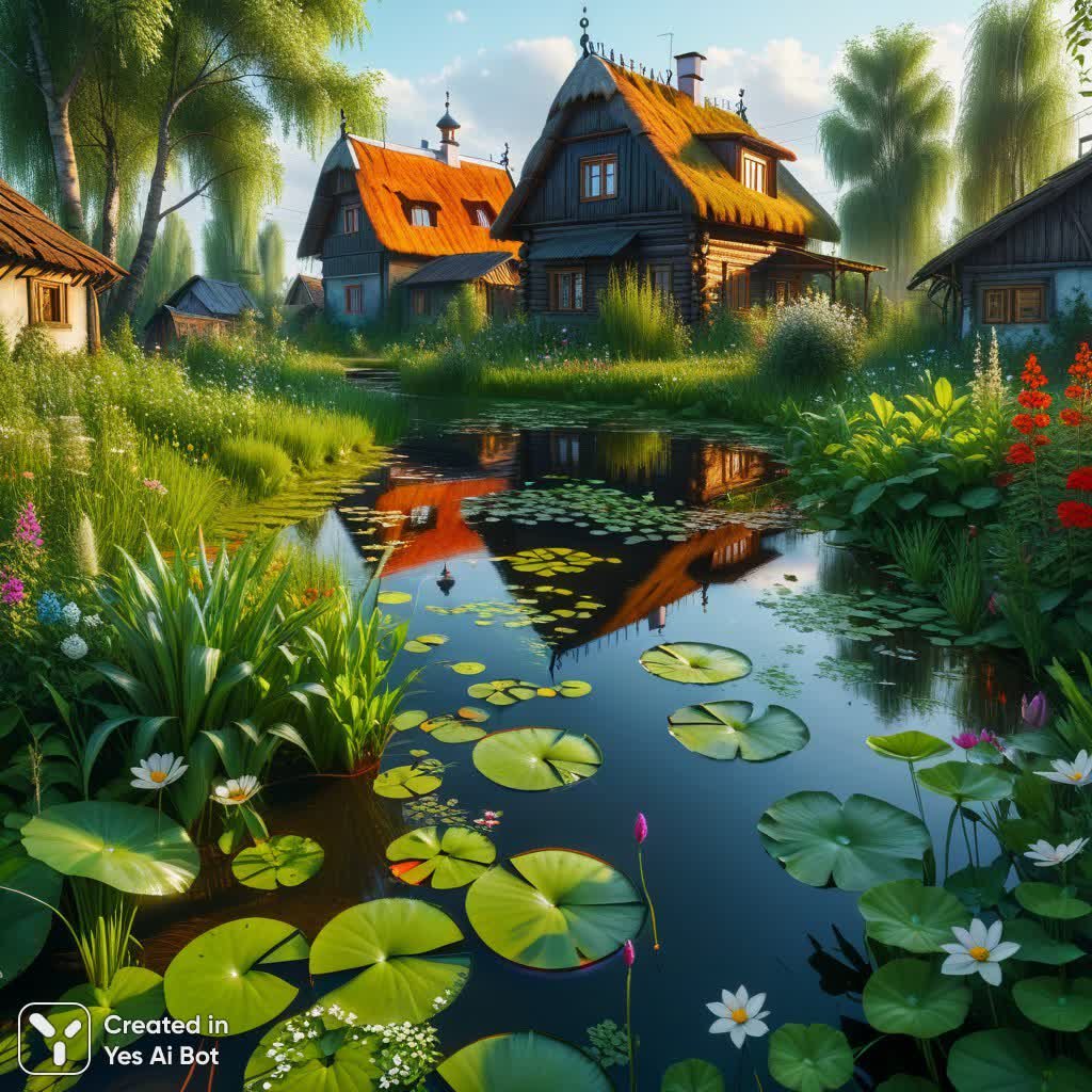 Заросший пруд возле красивых домиков русской деревни,много растений и травы, кусты, роса, разные цветы, разнотравье, ботаник-арт, реалистично, гиперреализм, гипердетализация, высокое качество, фотореализм, кинематографичность, профессиональное фото, четкий фокус, 5D, объемный рисунок, uhd, ray tracing, 64k