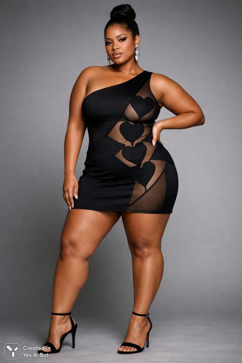 professional photo, studio lighting, canon eos r5, 85mm f/1.2 lens, high fashion, 3/4 view, full body, photorealistic, ultra detailed, editorial style, diverse body types, unique faces, model flaunting black one-shoulder piece, triple heart mesh details, sculpted X-shape strap, mix of sheer and opaque panels, attitude-filled editorial presentation.