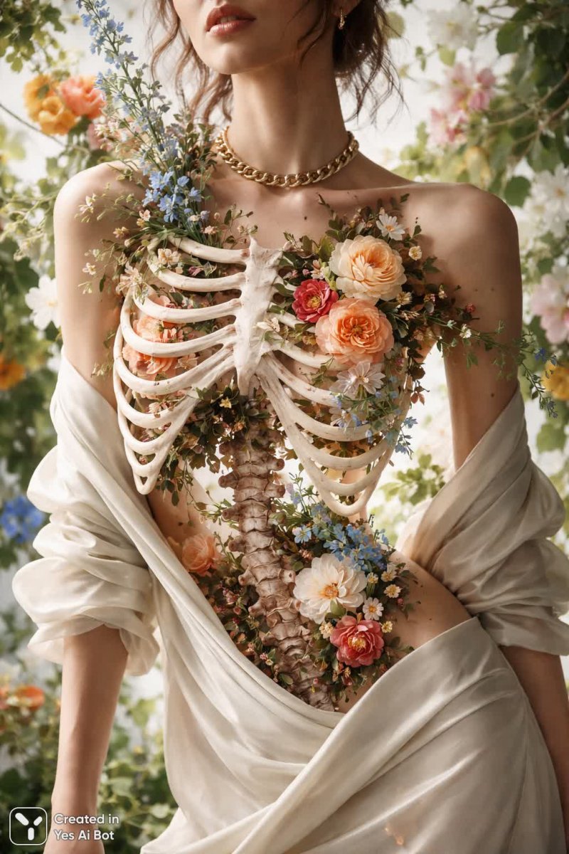 Завораживающая визуальная метафора хрупкости и преходящей красоты человеческого существования. Изображение демонстрирует фрагментированное тело человека, в котором участки реберной клетки и верхних конечностей прозрачны, открывая взгляду пышный сад, полный цветущих растений и яркой зелени. Это создает эффект двойственности: видимость тела переплетается с сокрытием, подчеркивая его уязвимость перед лицом природы. Буйство растительности за прозрачными участками словно поглощает фигуру, символизируя растворение личности в окружающем мире или переход от физического к духовному состоянию. Композиция вызывает глубокие размышления о связи человека и природы, о цикличности жизни и смерти, а также о красоте, скрытой в самых неожиданных формах. Искусство сочетает в себе анатомическую точность с фантастическими элементами, создавая сюрреалистичное видение человеческой формы, интегрированной в мир растений. Картина поражает своей эстетикой и провоцирует на размышления о природе бытия и месте человека во вселенной. Это не просто изображение тела, а поэтическая аллегория, наполненная символизмом и глубоким смыслом