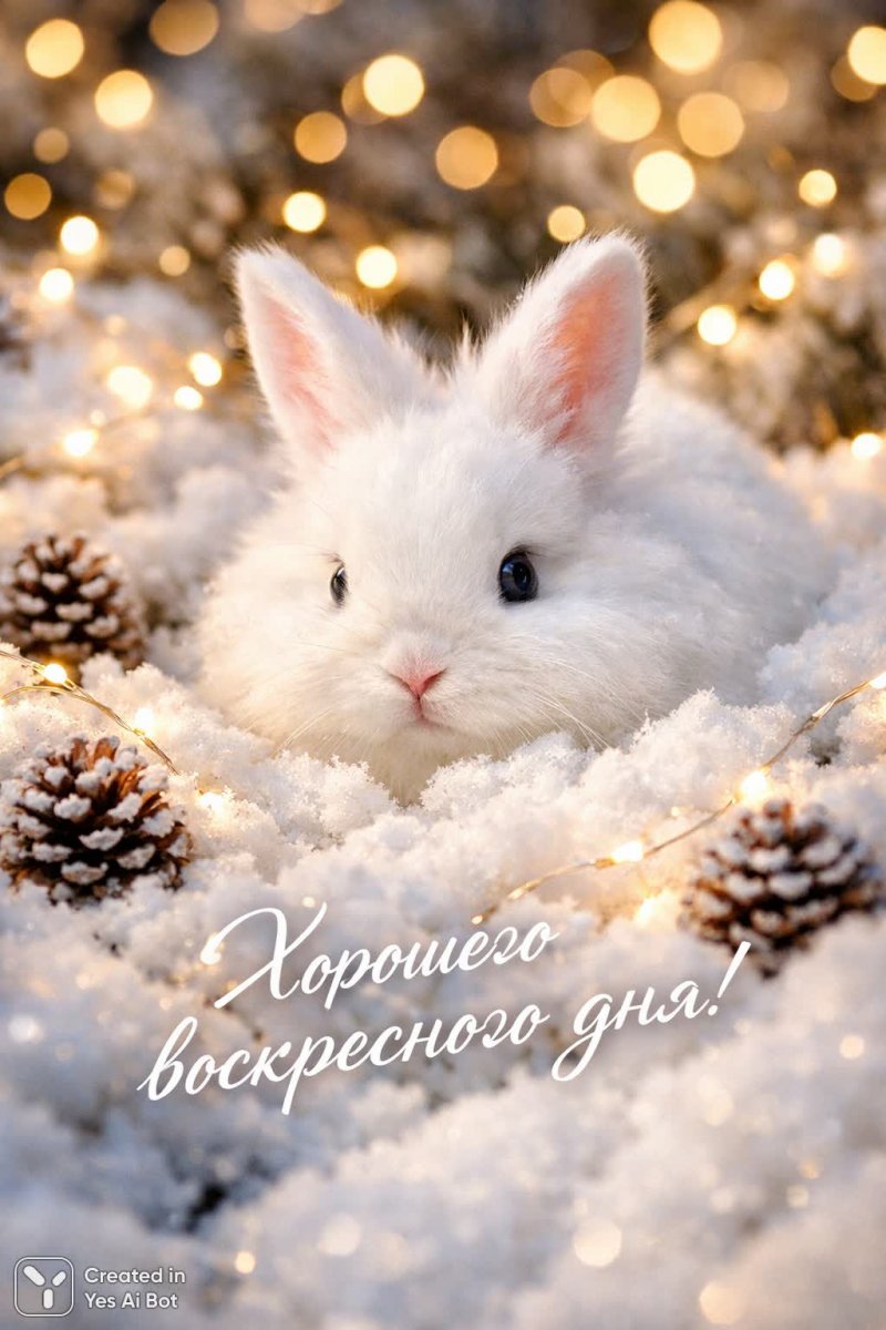 1. bokeh, professional photo, cozy, gentle light, angle from above, high details, photorealistic, tender mood, sony a7r iv, 50mm f1.2, soft glow, winter atmosphere, close-up: a fluffy white rabbit nestled in a pile of soft snow, surrounded by twinkling fairy lights and delicate pinecones, its ears perked up, blending perfectly with the winter wonderland. Text on Russian: "Хорошего воскресного дня!"