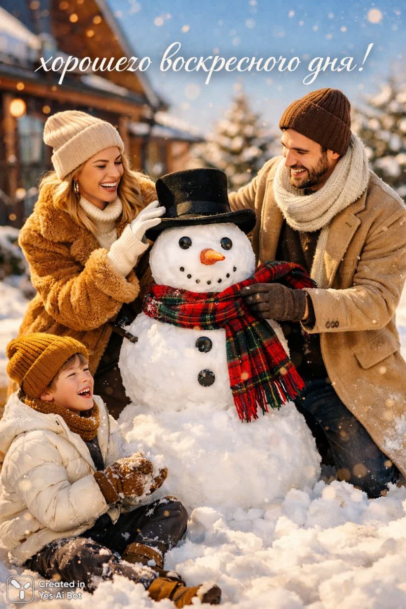 4. warm tones, professional photo, cozy, studio lighting, bokeh, high details, angle from above, tender mood, nikon z9, 85mm lens, photorealistic, soft glow, winter atmosphere, cute, wide shot: a family building a snowman together in their backyard, laughter echoing as they add colorful scarves and a top hat to their frosty creation under a clear blue sky. Текст на русском: "Хорошего воскресного дня!"