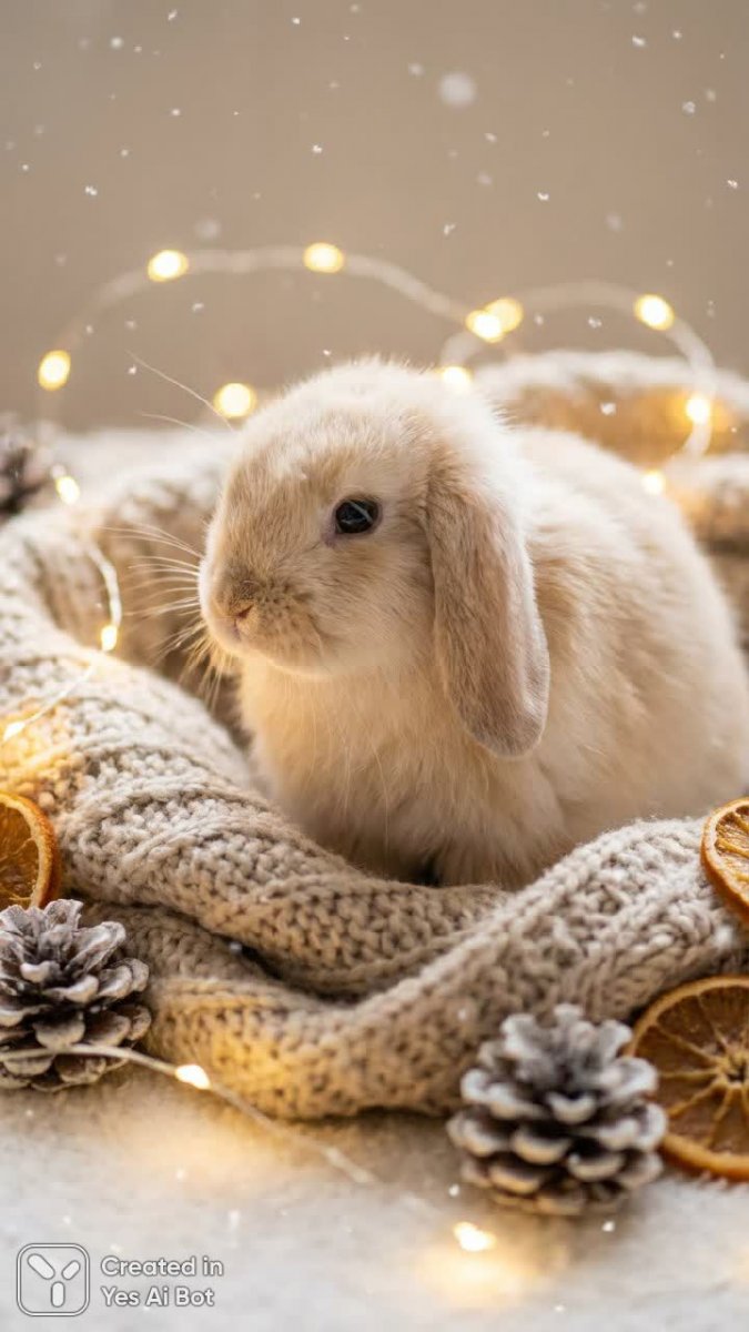 bokeh, professional photo, cozy, sony a7r iv, close-up, gentle light, 50mm f1.2, winter atmosphere, angle from side, warm tones, high details, soft glow, photorealistic, shallow depth of field, tender mood: a fluffy rabbit nestled in a knitted blanket, surrounded by twinkling fairy lights, tiny snowflakes drifting down around it.