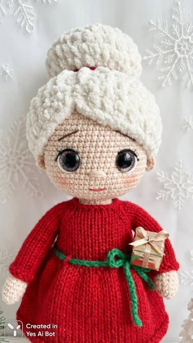 crocheted doll with fluffy white hair styled in a snowy bun, wearing a bright red dress with a green belt, holding a small gift in one hand, big sparkly eyes filled with excitement, BG is white with snowflakes.