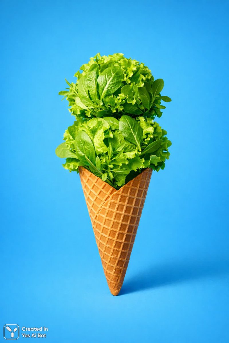 3. a surreal arrangement of a two-scoop ice cream cone made from bright green salad leaves, placed on a vivid blue background, playful minimalism, soft studio lighting, crisp focus, innovative food art.