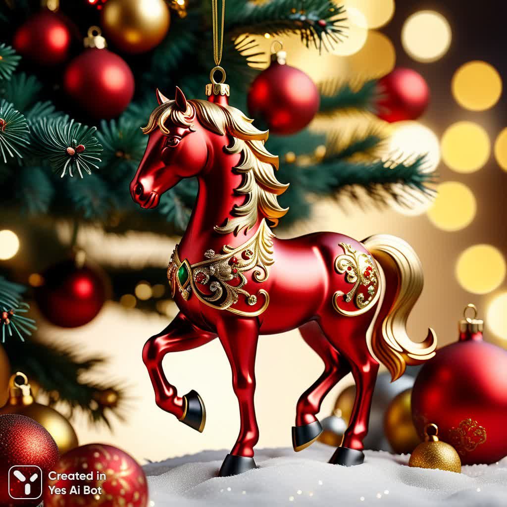 Изысканная трехмерная иллюстрация в гиперреалистичном стиле, созданная с использованием передовых технологий, напоминающих возможности DALL-E 3. Вертикальная композиция фокусируется на деталях великолепного новогоднего украшения – фигурки грациозной лошади, застывшей в прыжке. Лошадка выполнена в насыщенном матовом красном цвете, а ее тело, шея и ноги украшены сложной золотой филигранной резьбой, добавляющей образу роскоши и праздничного настроения. Тщательно проработанная скульптура передает динамику движущейся лошади: развевающиеся красные грива и хвост создают эффект полета, а золотая морда, копыта и седло подчеркивают благородство животного. Украшение нежно подвешено на тонкой золотой нити к ветке пушистой зеленой елки, создавая ощущение легкости и воздушности. На заднем плане расплывается праздничная картина: рождественская ель, украшенная множеством красных и золотых шаров, а вокруг мерцают теплые желтые блики боке, словно от отраженных огней свечей или гирлянд. Изображение выполнено в высочайшем разрешении 8k, что позволяет рассмотреть каждую деталь с поразительной четкостью и реалистичностью, передавая атмосферу волшебства и предвкушения новогодних чудес. Это настоящее произведение искусства, способное украсить любое пространство и подарить ощущение праздника