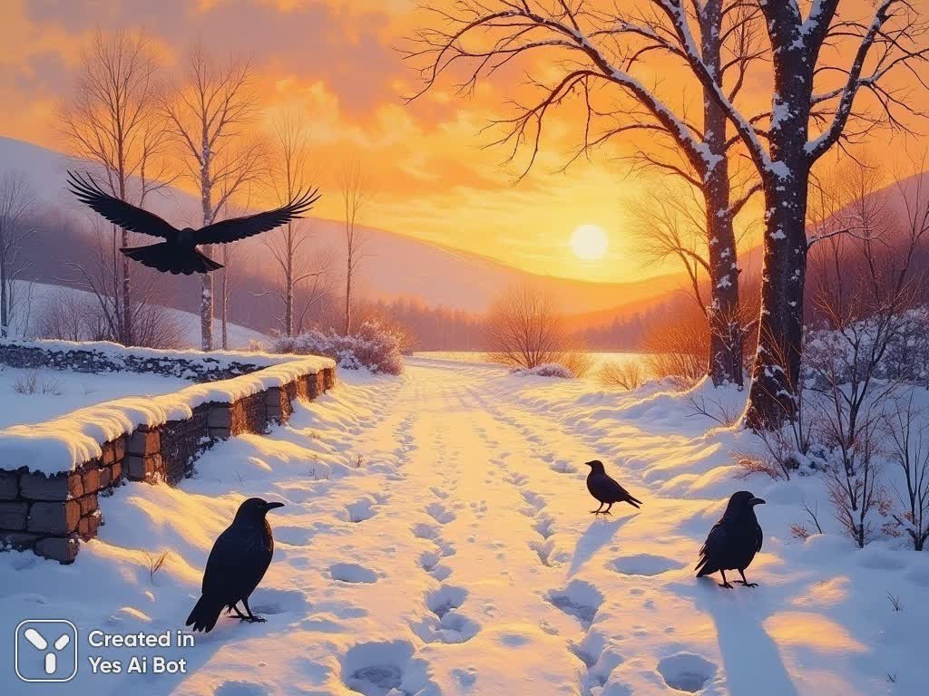 A serene winter landscape bathed in the warm glow of the setting sun. In the foreground, a snow-covered path with footprints leads to the middle ground. Three crows are in the foreground: one is flying with its wings spread, another is sitting on the snow-covered ground, and the third is standing with its beak open. A low stone wall runs along the left side of the path, creating a visual boundary. Bare, leafless trees stand out against the backdrop of a bright, fiery sunset. To the left rises a gentle hill covered with snow, contrasting with the warm tones of the sky. The light casts long shadows on the snow, enhancing the sense of depth. T...