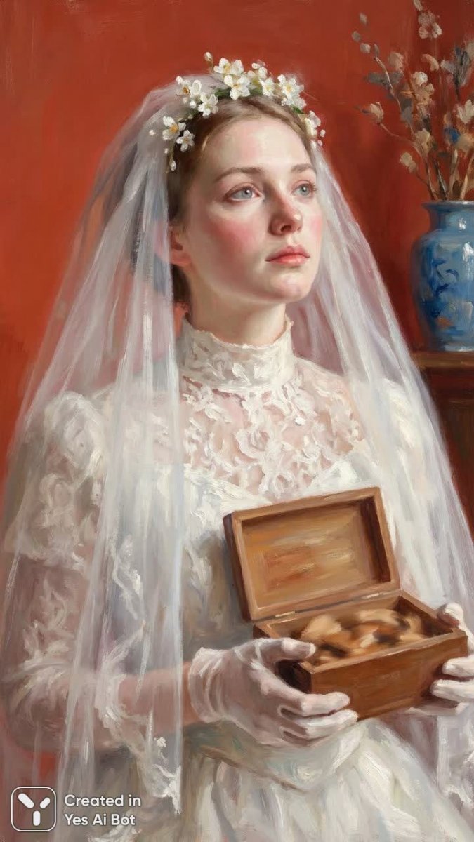 Нежная импрессионистская картина, запечатлевшая юную девушку в белом кружевном платье и прозрачном покрывале, украшенном венком из белоснежных цветов. Ее спокойное лицо с легким румянцем обрамлено светлыми волосами, а взгляд устремлен вверх, выражая задумчивость и некую отрешенность от мира. Фон картины выполнен в насыщенных красных и оранжевых тонах, контрастирующих с бледностью кожи девушки и белизной ее наряда. В правом верхнем углу композиции заметен декоративный синий вазон с ветвями, добавляющий картине глубины и изысканности. В руках девушки – небольшая открытая прямоугольная шкатулка, содержимое которой, кажется, состоит из светло-коричневых предметов, окутанных мягким светом. Мягкое рассеянное освещение подчеркивает тонкость деталей кружева, прозрачность покрывала и деликатность черт лица модели, создавая атмосферу романтики и мечтательности. Техника живописи отличается заметными мазками, характерными для импрессионизма, что придает картине особую легкость и воздушность. Вертикальная композиция фокусирует внимание на изящных чертах лица девушки и красоте ее одежды, создавая ощущение хрупкости и нежности. Это портрет, полный грации и загадочности, отражающий внутреннюю чистоту и спокойствие своей модели. Картина словно шепчет о тайне, скрытой в глубине ее глаз