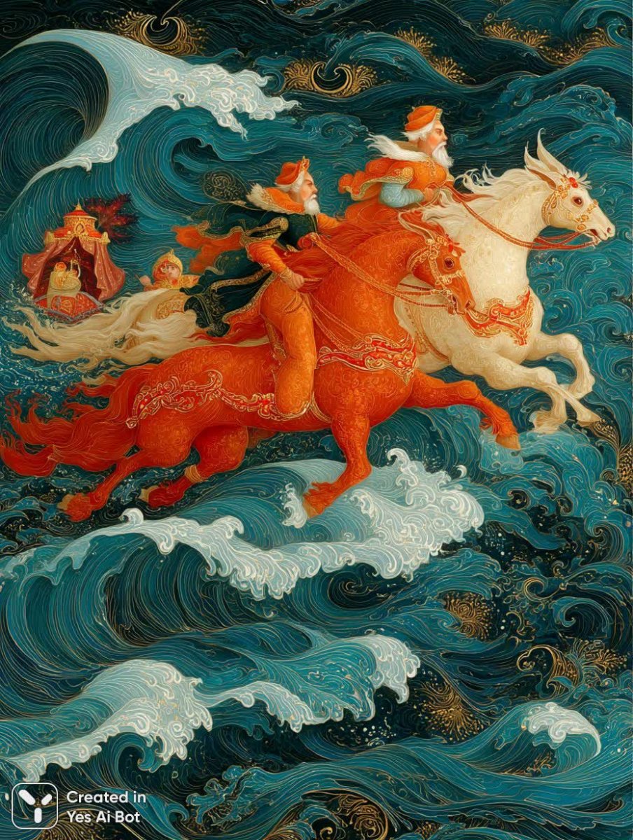 "Холуйская лакированная шкатулка: яркие чистые краски, выразительные контуры, декоративные цветочные мотивы вокруг сцены. Трое алых коней в тройке мчат по снежному русскому пейзажу, Дед Мороз играет на гармони, меха раздуты, Снегурочка в традиционном наряде. Гладкий блеск лака, насыщенные красные и синие тона, обильные узоры и золотая кайма, тонкая прорисовка деталей." --ar 3:4 --q 2 --v 6 --s 750