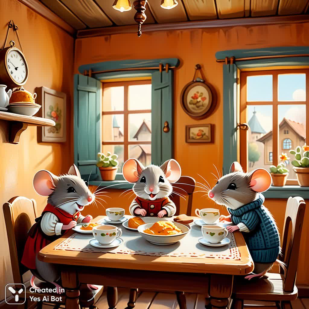 A cute cartoon mouse family sitting together at a dining table and eating a meal inside a cozy vintage house.Mother mouse, father mouse and their little mouse children, all dressed in charming vintage clothing.
