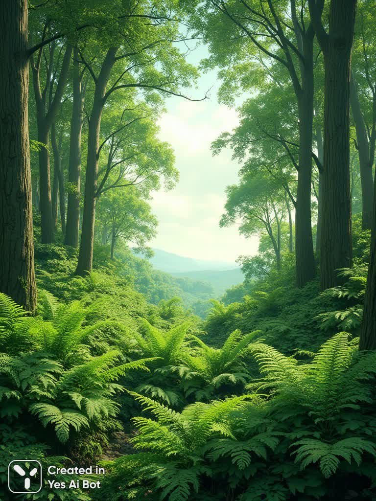 Погрузитесь в завораживающую красоту пышного зеленого леса, где высокие стройные стволы деревьев устремляются ввысь, а их кора варьируется от коричневого до серого, демонстрируя разнообразие текстур и оттенков. Густые слои листвы наполняют средний план, представляя собой калейдоскоп форм и фактур листьев, где яркие светлые зеленые участки контрастируют с более темными затененными зонами. В переднем плане величественные папоротники с детализированными листьями изящно ниспадают, освещенные мягким естественным светом, создавая завораживающую игру света и тени. За просветленным участком леса виднеется бледное голубое небо, намекающее на пейзаж вдалеке, что создает ощущение глубины и простора. Общая атмосфера спокойствия и умиротворения пробуждает чувство безмятежности и естественной красоты, словно созерцая полотно великого художника-пейзажиста. Палитра цветов, доминирующая в зеленых, коричневых и нежных голубых оттенках, создает сбалансированную и визуально гармоничную композицию, вызывающую ощущение покоя и единения с природой. Этот пейзаж – ода красоте дикой природы, приглашающая зрителя на прогулку по тихим тропам и созерцанию вечной гармонии мира