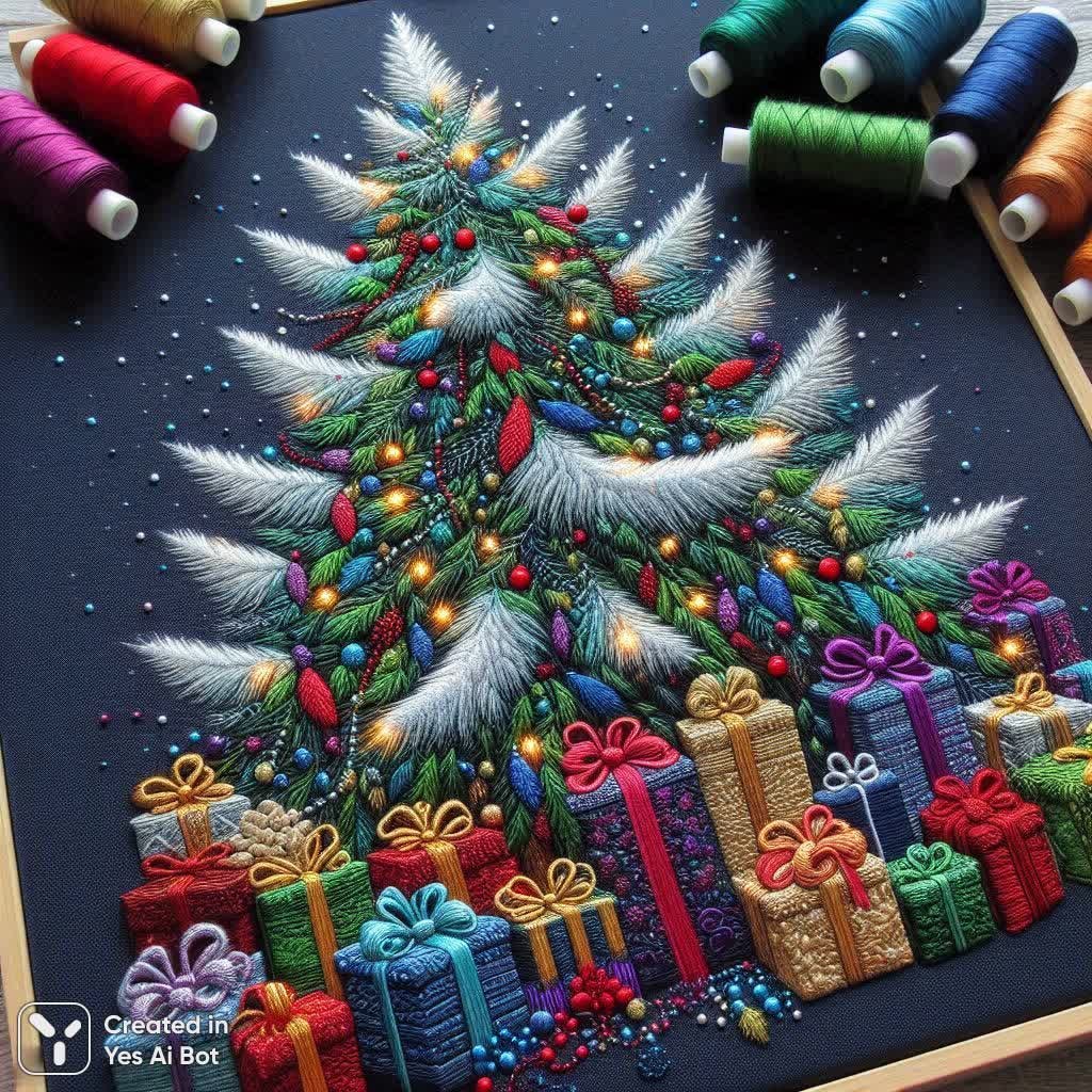 Beautiful machine embroidery on textured navy blue linen fabric. A majestic, fluffy white winter spruce tree. The tree is decorated with vibrant, glowing Christmas garlands in emerald, ruby, and gold. Festive gift boxes with ribbons are nestled under the tree. Rich embroidery texture, visible stitching threads, folk art, whimsical holiday scene, high detail, masterpiece