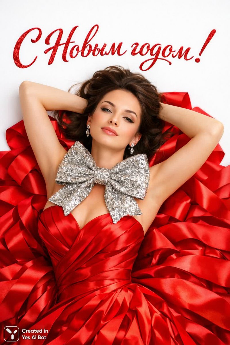 Новогодняя элегантность: портрет в алом шелковом платье и блестящем банте - Картинка, полученная с помощью нейросети Sora Image