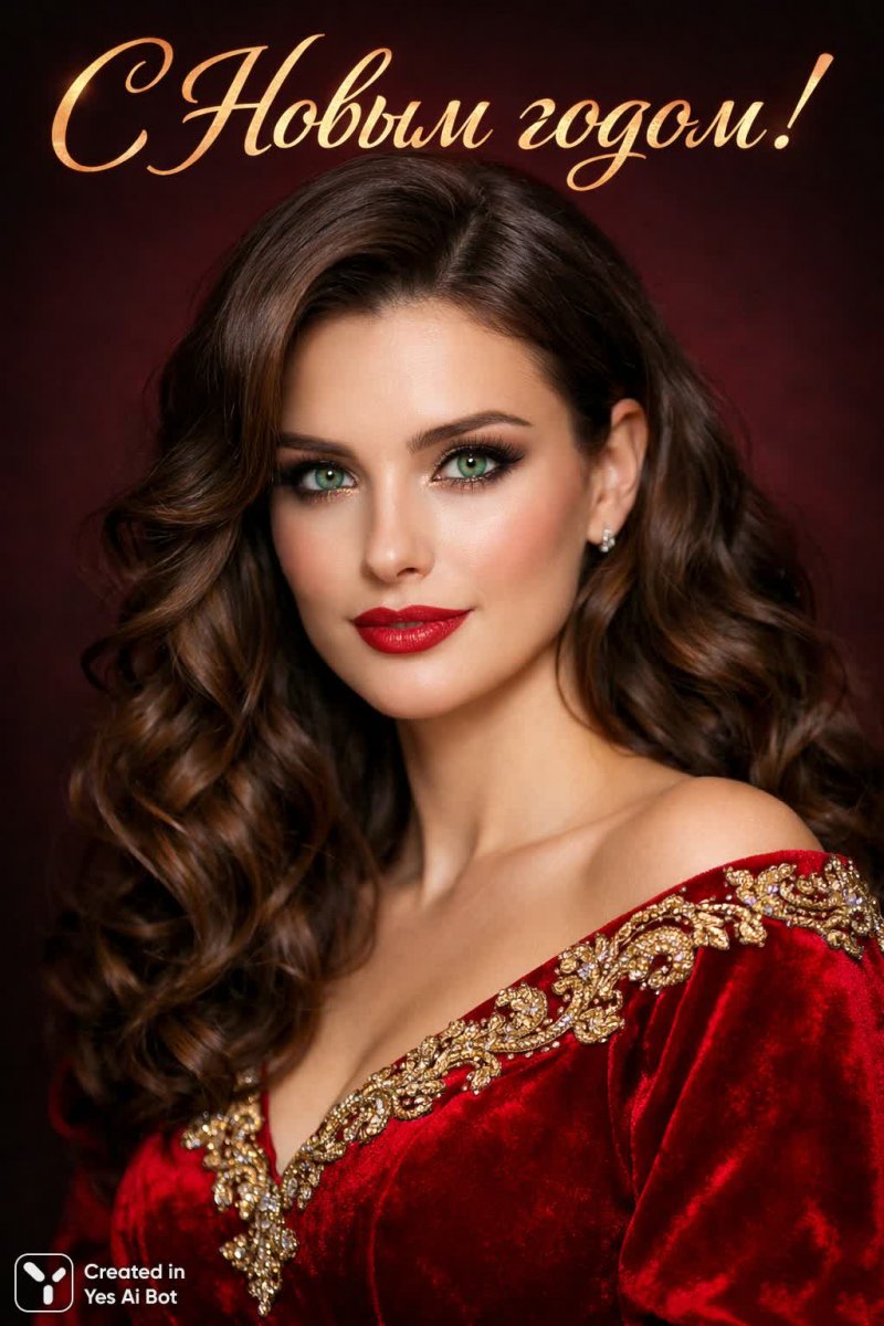 1. text on russian beauty letters: "happy new year!" hyper-realistic close-up portrait of woman with smooth fair skin, bright emerald green eyes, wearing a luxurious red velvet dress with golden embroidery, soft curls cascading down her shoulders, BG is deep dark burgundy, even diffuse lighting, canon eos r5, rf 85mm f/1.2l lens, eye-level angle, sharp detail, fashion magazine style.
