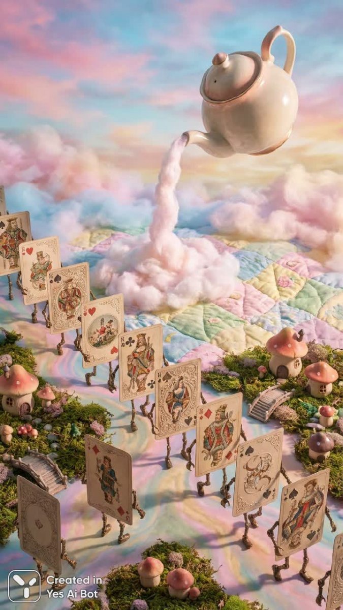 2. professional photo, sony alpha, 50mm lens, high detail, angle top-down view, surreal style, photorealistic, playing cards with intricate designs coming to life, marching in unison, a backdrop of a sky filled with flowing pastels, giant teapot pouring out clouds, a whimsical landscape unfolding beneath them.