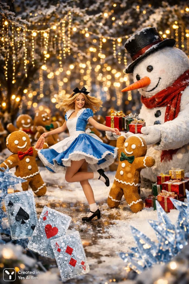 2. surreal photo, sony alpha, tilt shift, 35mm lens, photorealistic, chaotic arrangement, high detail, alice dancing with gingerbread men, twinkling fairy lights draping from the trees, a giant snowman with a carrot nose offering gifts, ice crystals forming into torn playing cards, cheerful warmth in the cold.