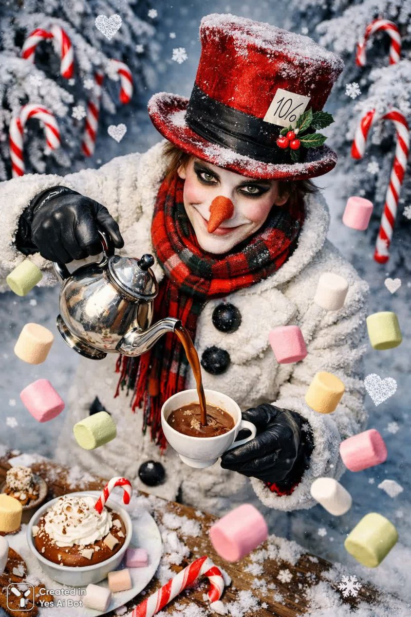 3. professional photo, canon eos r5, ultra sharp focus, 50mm lens, angle top-down view, surreal style, photorealistic, mad hatter dressed as a snowman, pouring hot cocoa from a teapot, colorful marshmallows floating in the air, trees draped in candy canes, snowflakes shaped like hearts.