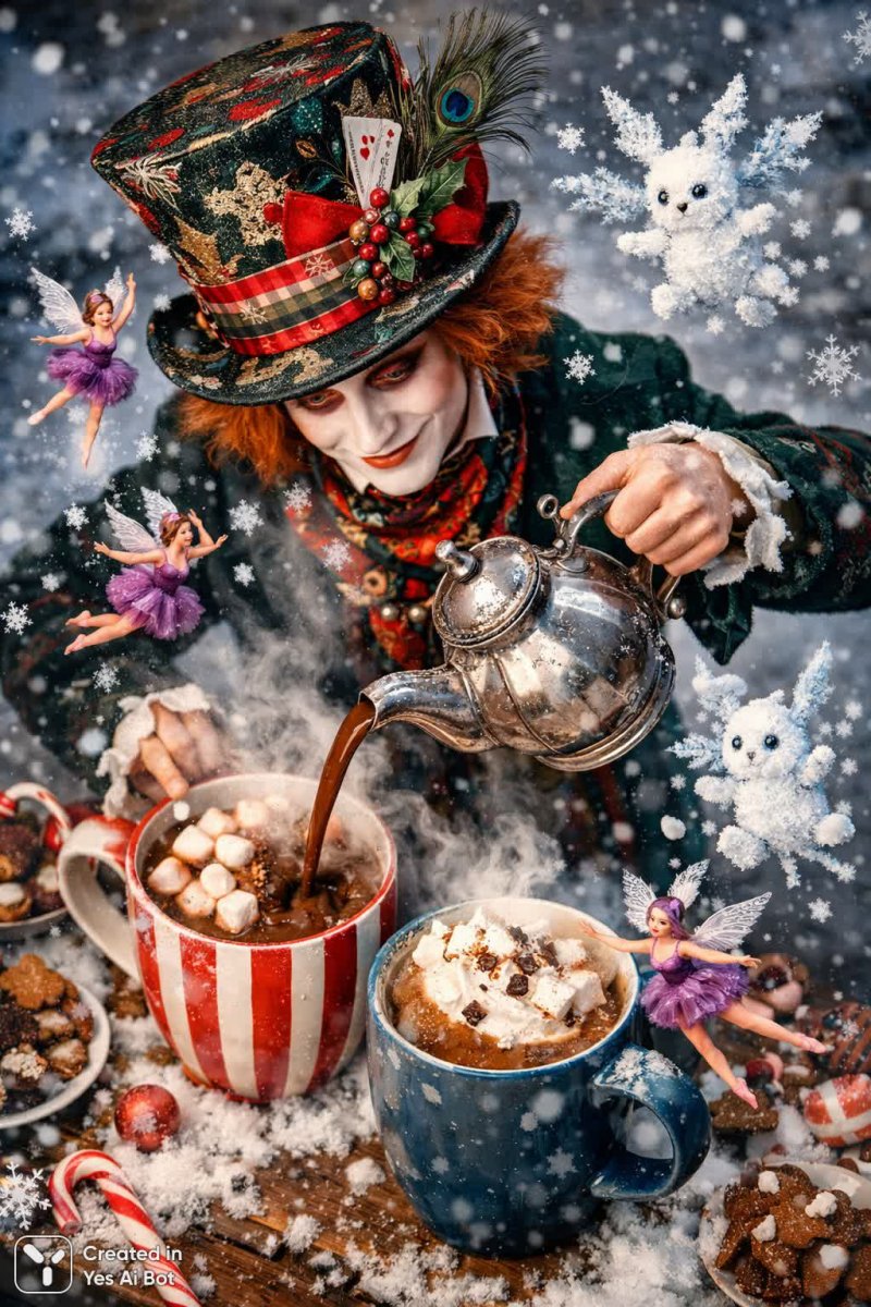 2. professional photo, sony alpha, angle top-down view, 50mm lens, high detail, surreal style, photorealistic, mad hatter wearing a festive hat, pouring steaming cocoa into oversized mugs, sugar plums dancing in the air, snowflakes transforming into whimsical creatures in a winter wonderland.