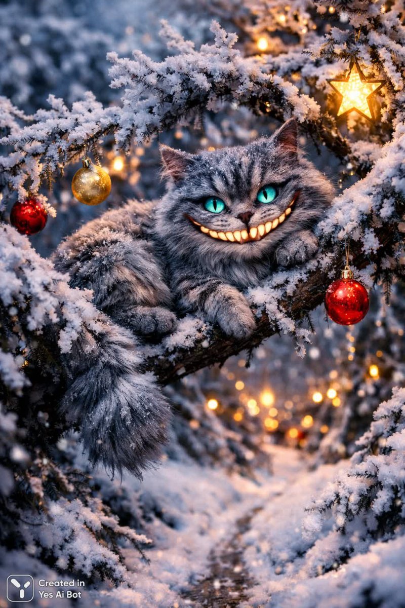3. surreal photo, high detail, canon eos r5, tilt shift, 35mm lens, ultra sharp focus, photorealistic, cheshire cat lounging in a snow-covered tree, fur blending into the frosted branches, mischievous grin illuminated by glowing holiday ornaments, snow trails leading to a hidden wonderland.