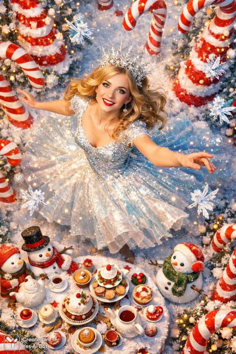1. surreal photo, professional photo, canon eos r5, angle top-down view, ultra sharp focus, high detail, photorealistic, alice adorned with a glittering snowflake crown, wearing a dress shimmering between holiday lights, dancing amidst candy cane trees, snowflakes transformed into tiny creatures, a festive tea party with snowmen, vibrant winter colors.