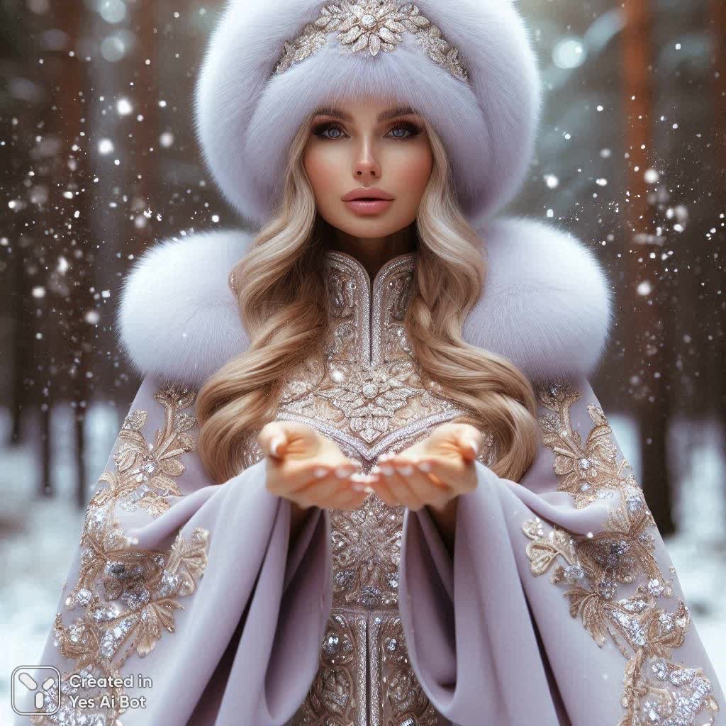 Завораживающая сцена зимней сказки оживает в этом изображении. В центре внимания – Снегурочка, воплощение нежной красоты и волшебства. Она одета в роскошный кафтан цвета слоновой кости с изящной золотой вышивкой и пушистой белой отделкой из меха. На голове у нее шапка того же оттенка, украшенная мехом, а светлые волосы аккуратно заплетены в косы. Снегурочка стоит в глубине заснеженного леса, ее ладони протянуты вперед, словно рождая чудо. Она выдыхает облако снежинок, которые, увеличиваясь в размерах, летят прямо на зрителя, создавая ощущение погружения в зимнюю атмосферу. Мягкий свет заходящего солнца окрашивает снежинки в нежные розово-желтые тона, контрастирующие с холодными оттенками зимнего леса. Этот эффект создает волшебное сияние и подчеркивает красоту момента. На переднем плане парят несколько крупных снежинок, добавляя глубины и реализма композиции. Кажется, что время замерло в этом моменте, позволяя зрителю ощутить всю прелесть зимней природы и загадочность персонажа. Изображение передает атмосферу уюта и тепла, несмотря на холодную зимнюю обстановку, благодаря нежному освещению и изысканному наряду Снегурочки. Это визуальная поэма о зиме, красоте и волшебстве, способная тронуть сердца всех, кто ее увидит