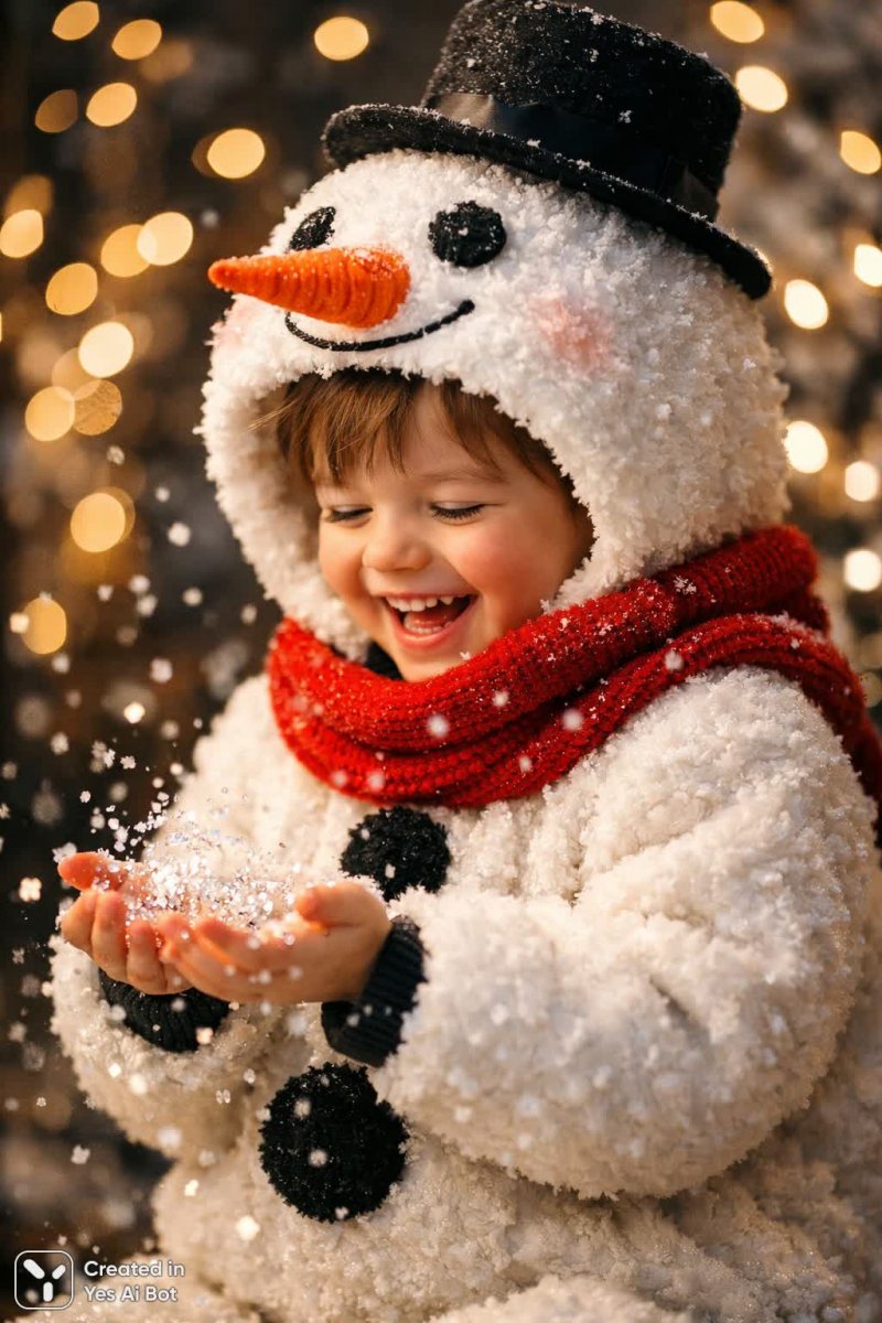 1. cozy, professional photo, 50mm f1.2, angle from side, soft glow, photorealistic, shallow depth of field, tender mood, cute, winter atmosphere, high details, studio lighting, bokeh, close-up: a little boy in a fluffy snowman costume, giggling as he plays with sparkling snowflakes, surrounded by twinkling lights on a frosty evening.