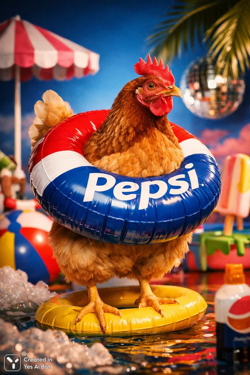 1. studio photo, photorealistic style, shot on canon eos r5, 50mm lens, surreal, hyper-detailed, pepsi logo as a flotation device on a rubber chicken, wacky background, bold colors, humorous, cinematic lighting, unexpected composition, logo art, high resolution.
