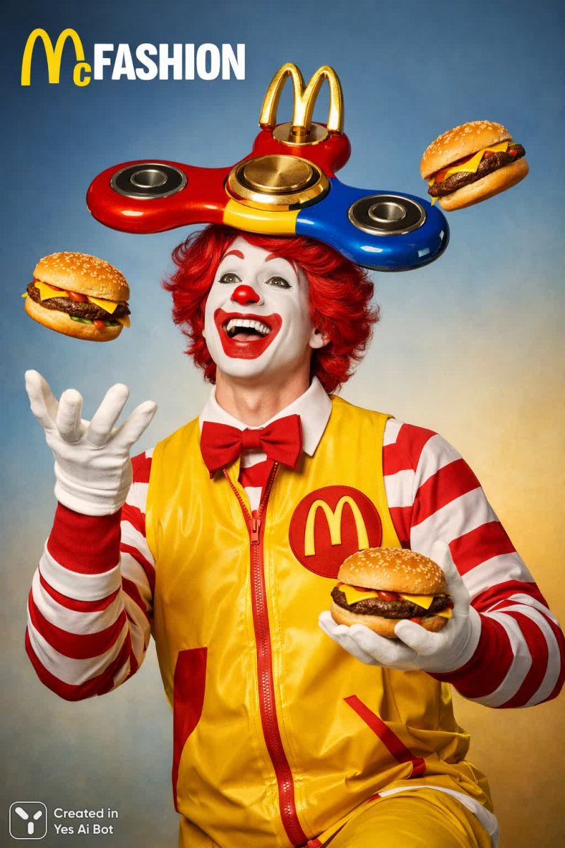 3. studio photo, photorealistic style, shot on canon eos r5, 50mm lens, humorous, surreal, mcdonald's clown juggling cheeseburgers while wearing a fidget spinner hat, bright colors, high resolution, cinematic lighting, unexpected logo art, bold and playful.