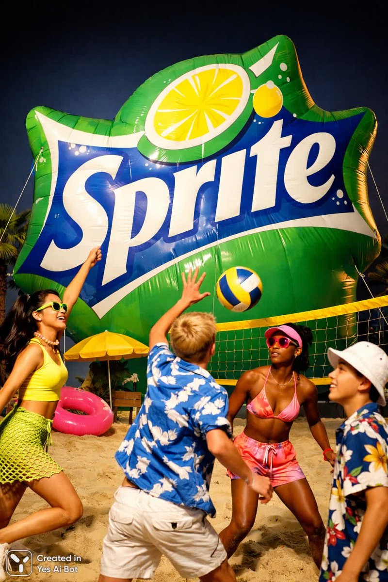 4. studio photo, photorealistic style, shot on canon eos r5, 50mm lens, cinematic lighting, sprite logo transformed into a giant inflatable for a beach party, kids playing volleyball, vivid colors, humorous, high resolution, logo art, unexpected, wacky montage.