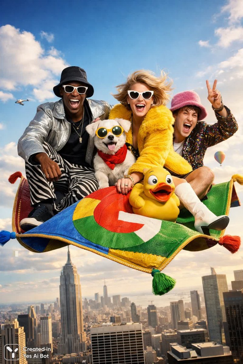 5. studio photo, photorealistic style, shot on canon eos r5, 50mm lens, cinematic lighting, surreal and playful, google logo as a colorful magic carpet flying through a cityscape, goofy characters riding it, bright backgrounds, logo art, hyper-detailed, unexpected, funny, high resolution.