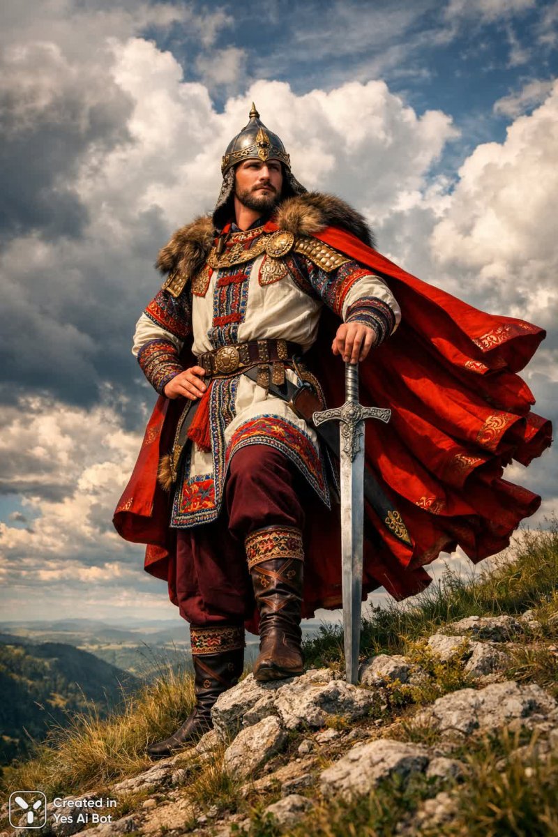 4. legendary bogatyr, ilya muromets, heroically posed on a hill, dramatic clouds above, colorful traditional garb, epic fairy-tale scene, professional photo.