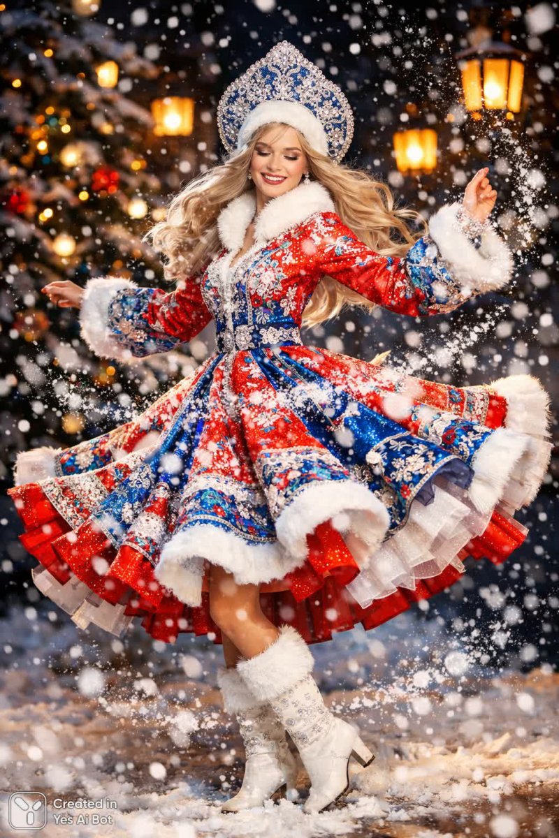 Яркое новогоднее торжество в лучших традициях русской культуры. На фотографии запечатлена Снегурочка, грациозно танцующая в пышном красочном платье под кружащимся вихрем снежинок. Мягкий свет фонарей создает атмосферу волшебства и уюта, подчеркивая праздничное настроение. Изображение излучает радость и веселье, передавая дух настоящего новогоднего чуда. Профессиональная съемка позволила максимально точно отразить детали костюма Снегурочки, игру света и тени, а также динамику танца. Кажется, будто время остановилось в этот волшебный момент, чтобы подарить зрителю ощущение сказки и предвкушение новогодних чудес. Этот снимок – воплощение традиционных русских новогодних гуляний, наполненное искренней радостью, весельем и неповторимой атмосферой зимнего праздника. Он станет прекрасным украшением интерьера или оригинальным подарком для близких людей, которые любят русскую культуру и ценят красоту традиций. Фотография передает тепло домашнего очага и ощущение счастья от встречи Нового года в кругу семьи и друзей. Это настоящее произведение искусства, которое заставляет поверить в чудо и почувствовать себя частью волшебного новогоднего мира