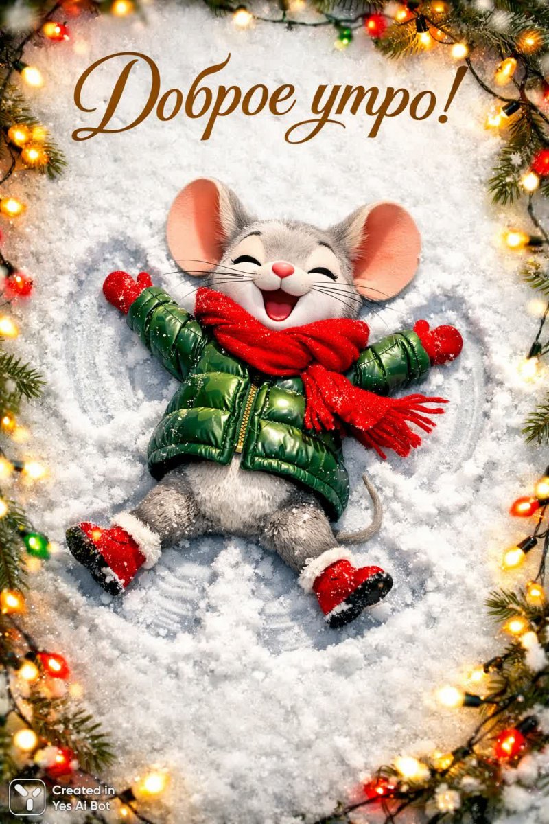 3. text on russian: "good morning!" a cartoonish mouse wearing a cozy green sweater and a red scarf joyfully makes snow angels in fresh powder, surrounded by twinkling holiday lights.