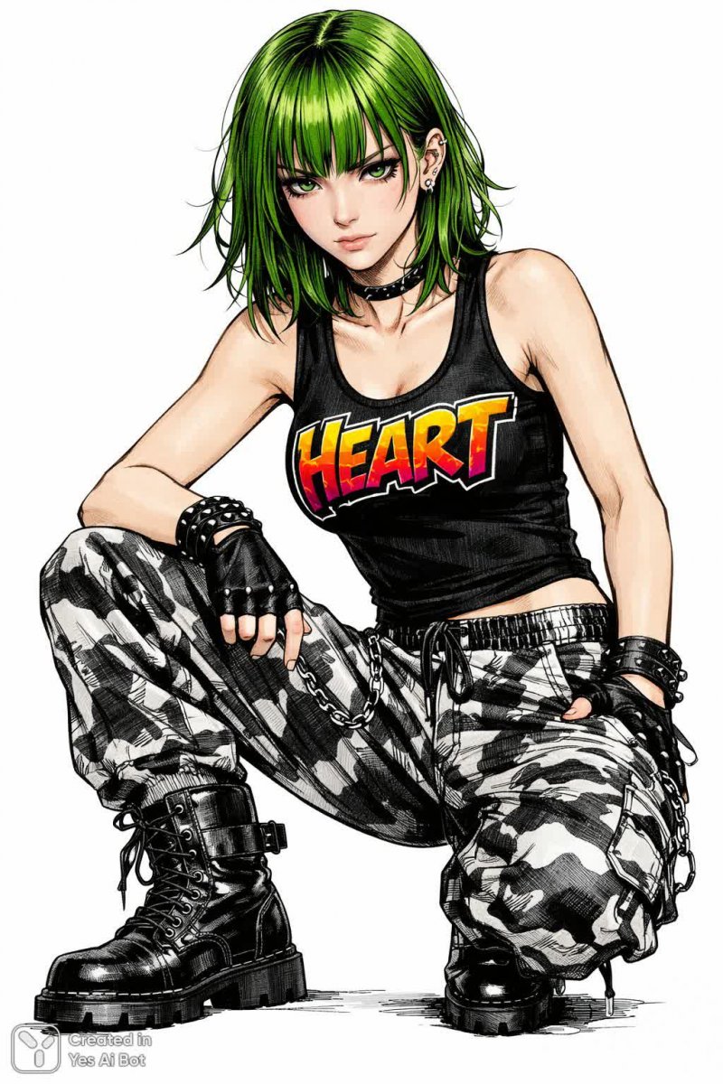 3. illustration, ink drawing, anime-inspired, detailed illustration, photorealistic, white background, fierce anime girl with green hair and bangs, wearing a sleek tank top showcasing "WILD HEART" in bold, vibrant colors, patterned joggers, combat boots, strong pose with a piercing gaze, intricate details on attire.