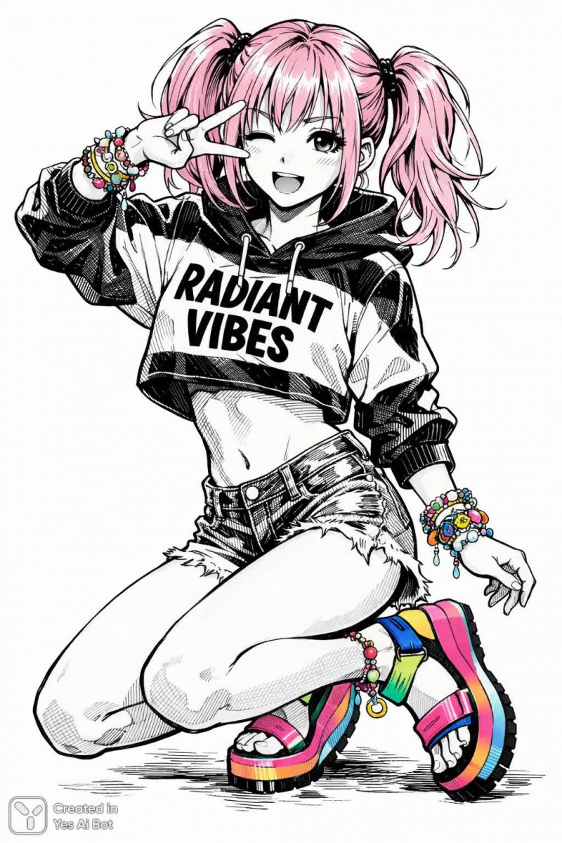 2. ink drawing, illustration, anime-inspired, detailed illustration, white background, stylish girl with pastel pink hair in pigtails, cropped hoodie with "RADIANT VIBES" boldly printed on front, high-waisted denim shorts, colorful platform sandals, playful pose, charm bracelets, focus on bright clothing elements.