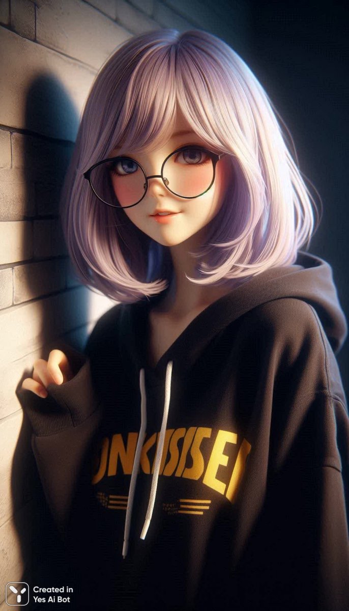 Изысканный портрет юной девушки в стиле аниме, запечатленный профессиональным фотографом с использованием высококачественного оборудования Sony Alpha 7R IV и объектива 35mm. Кадр выполнен под боковым углом, подчеркивая ее миловидное лицо со светлой кожей и нежно-лавандовой шевелюрой средней длины. Образ дополняют стильные элементы гардероба: черный укороченный худи с яркой надписью 'SUNKISSED' на груди и свободные карго-брюки, создающие непринужденный и модный силуэт. Крупные очки придают образу игривости и акцентируют внимание на деталях. Девушка легко опирается о стену, ее выражение лица излучает беззаботность и позитив. Мягкие тени добавляют глубины и объема, а фокус сосредоточен на одежде и аксессуарах, демонстрируя их текстуру и качество. Чистый фон студии позволяет полностью оценить композицию и детализацию снимка. Высокое разрешение передает мельчайшие нюансы, создавая эффект присутствия и позволяя насладиться каждым элементом этого стильного и запоминающегося портрета. Этот снимок – идеальное сочетание профессиональной фотографии и эстетики аниме-культуры