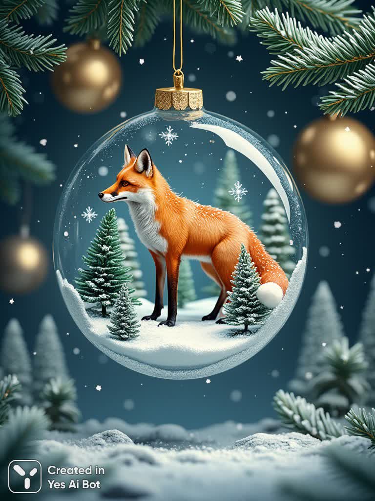 A captivating, close-up photograph featuring a transparent, spherical Christmas ornament filled with a miniature winter landscape. Inside, a vibrant fox, characterized by its distinctive orange and white fur, stands gracefully amidst a snowy, pine-filled scene. The fox, viewed from a slightly low angle, appears poised and alert, its expression suggesting curiosity. Surrounding the fox, several stylized miniature evergreen trees coated with fresh snow punctuate the foreground, adding depth. The snow-covered ground within the ornament evokes a sense of winter tranquility. The backdrop showcases a twinkling, starry night sky. The ornament hangs ...