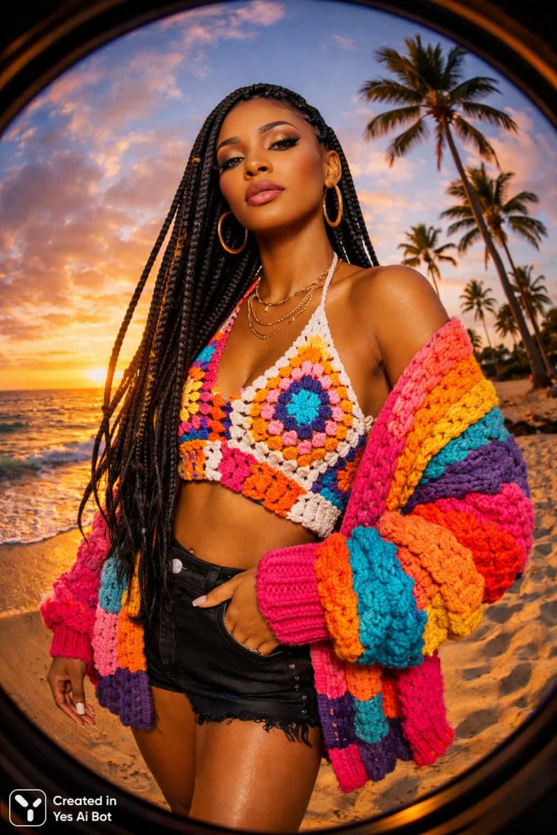 3. stylish woman with long braids, standing by the beach at sunset, wearing a crochet bikini and oversized cardigan, vibrant colors, confident pose, palm trees in the background, photorealism, high-resolution, mirrorless camera, fisheye lens.