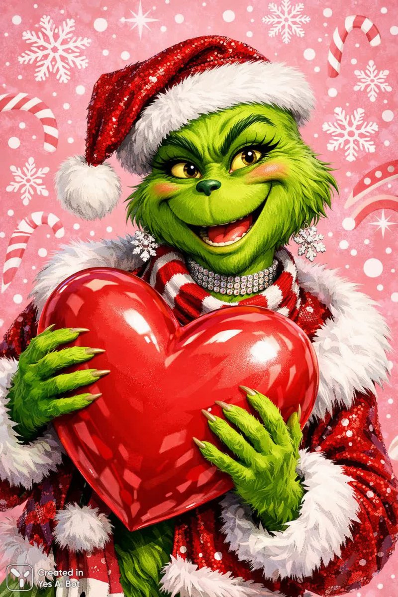 2. grinch wearing a christmas sweater, holding a giant heart, pink background with snowflakes, cartoon illustration, cheerful expression, creative patterns, charming vibes.