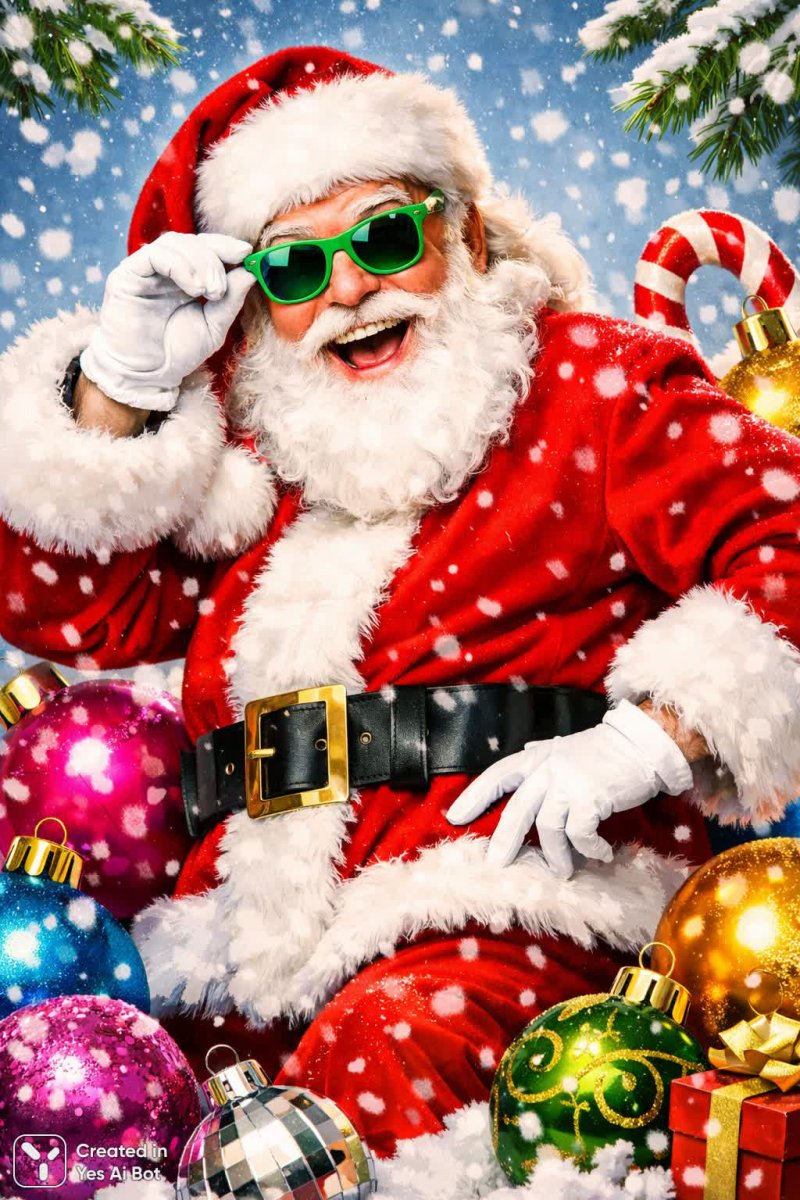 Весёлый Санта Клаус в очках и ярких украшениях на фоне зимы - Пример изображения из нейросети Sora Ai Images