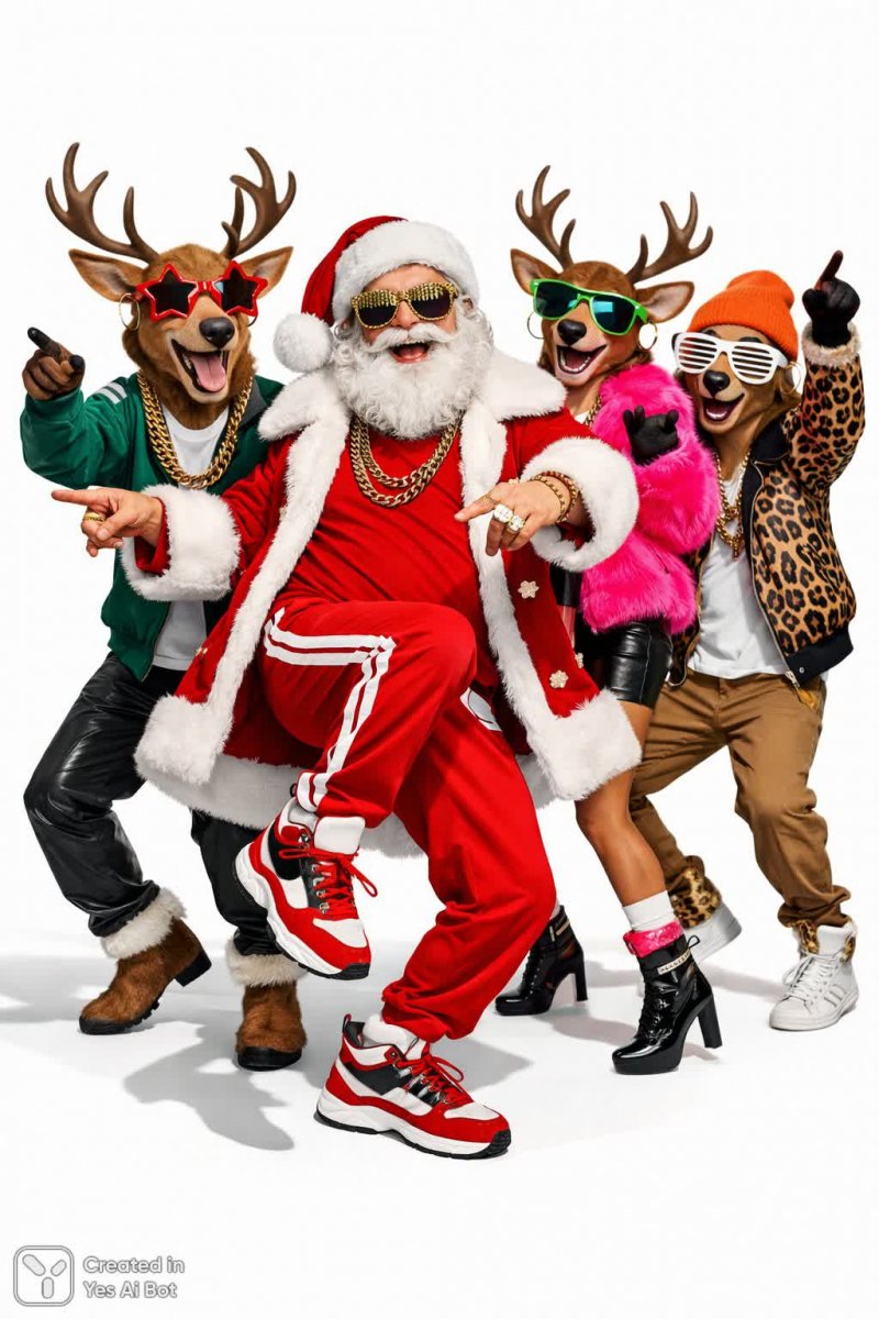 5. santa claus dancing with reindeers, wearing funky sunglasses, cheerful details, white background, fun and vibrant atmosphere, cartoon style.