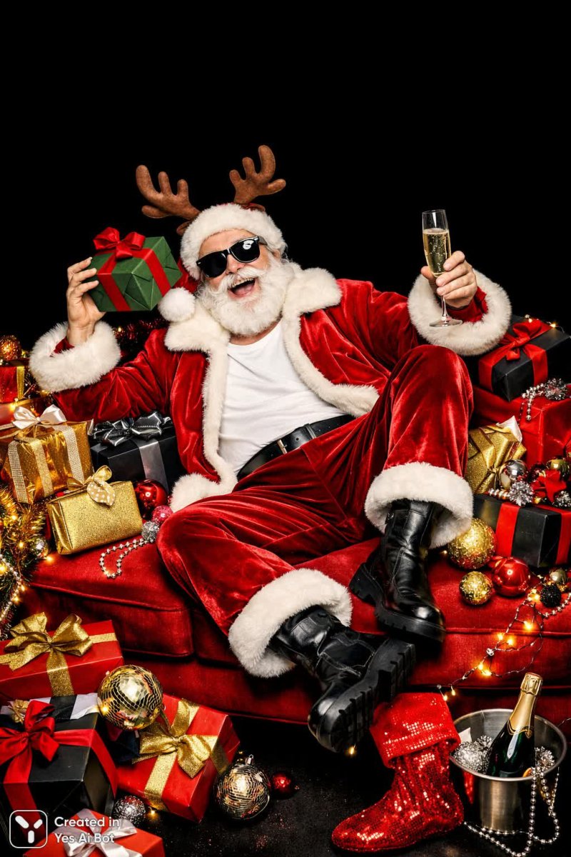 Веселый Санта-Клаус отдыхает в праздничной атмосфере. Представьте себе картину: добрый волшебник расслабленно разлегся на мягком диване, окруженный горой сверкающих новогодних подарков. На голове у него забавные оленьи рога, а лицо светится искренней радостью и беззаботным смехом. Черный фон контрастирует с яркими украшениями, создавая ощущение волшебства и сказки. Это изображение наполнено позитивом и хорошим настроением, идеально подходящим для создания праздничной атмосферы. Здесь гармонично сочетаются классический образ Санты и современная интерпретация – расслабленный Санта, наслаждающийся плодами своих трудов. Насыщенные цвета и детализированное исполнение делают эту иллюстрацию привлекательной и запоминающейся. Погрузитесь в атмосферу праздника вместе с этим забавным персонажем, который дарит тепло и радость каждому зрителю. Это отличный способ добавить немного волшебства в свой дом или офис, напомнив о чудесах зимнего сезона. Идеально для открыток, декораций или просто для поднятия настроения. Это не просто изображение – это воплощение духа Рождества!