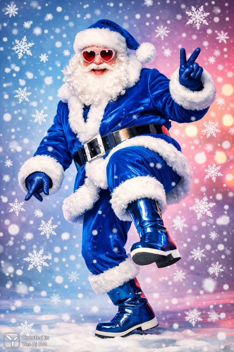 2. Santa Claus dancing, wearing a blue suit and heart-shaped sunglasses, vibrant colors, one leg raised in a playful pose, cartoon style, festive atmosphere with snowflakes around.