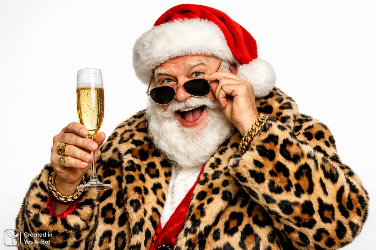 Весёлый Санта: Леопардовый стиль и игристое настроение - Генерация изображения с помощью нейросети Sora Ai Images