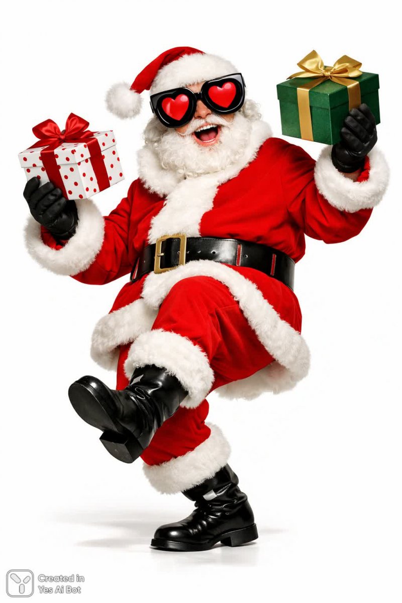 5. Santa in oversized glasses, dancing with gifts, red suit and hat, hearts for eyes, joyful mood, white background, humorous cartoon style.