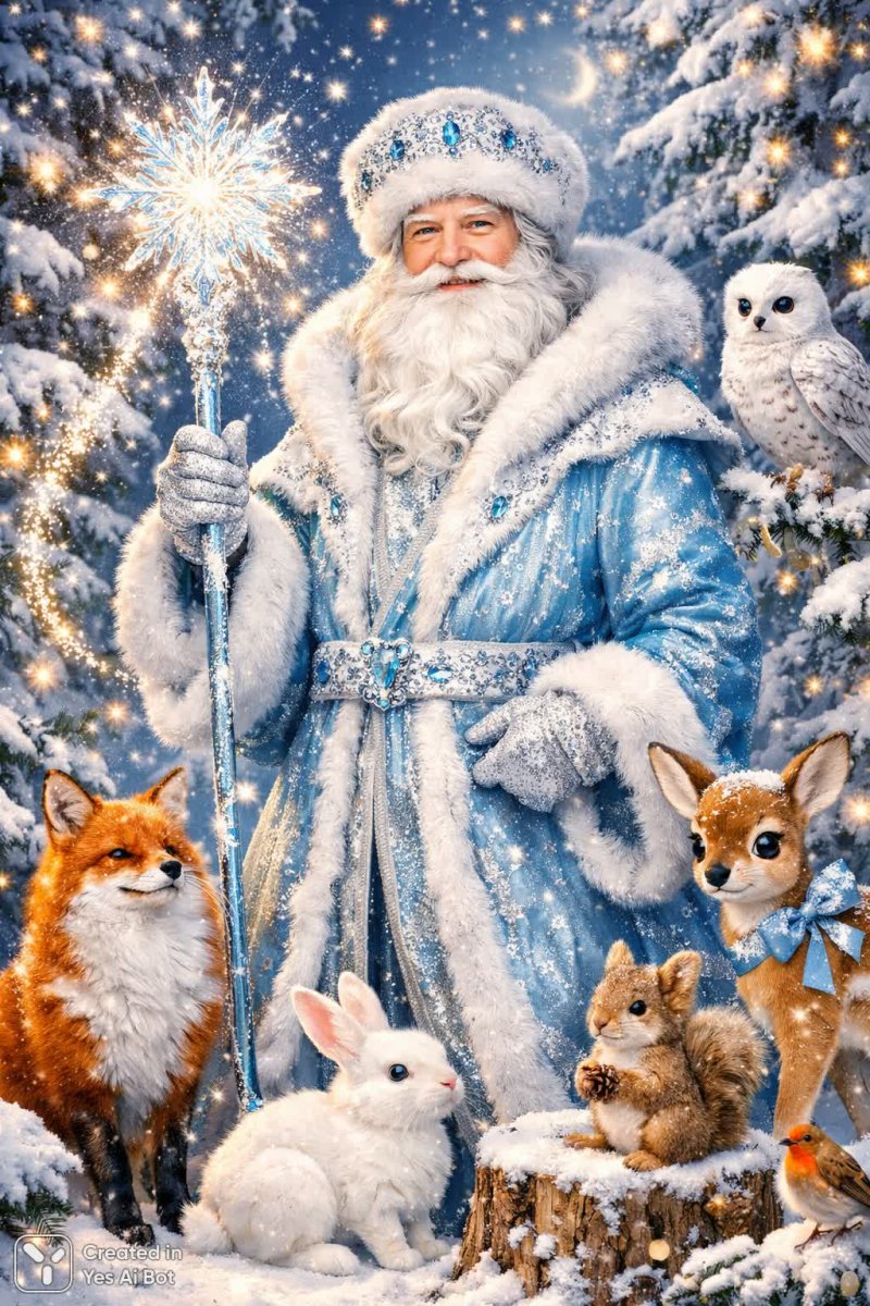 3. father frost with a sparkling staff, wearing a fur-lined hat, snowy woodland creatures around, cartoon style, bright colors, cheerful vibes, magical winter scene, light decorative accents.